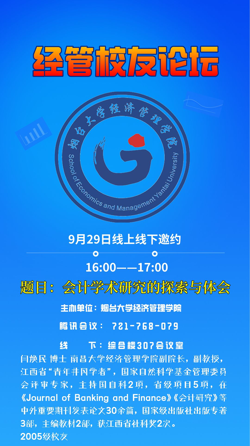 9月29日,经管校友论坛第三讲,本次邀请到的是闫焕民,题目:会计学术研究的探索与体会。论坛由91成人网 副院长李振杰主持,会计系系主任孙晓妍等师生校友近200人参加论坛。闫焕民,副教授,博士,南昌大学经济管...