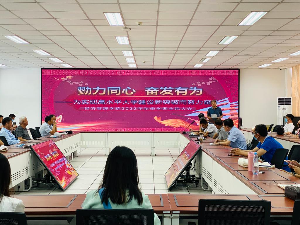 8月21日上午,烟台大学经济管理学院在综合楼307召开新学期教职工大会,学习传达学校处级干部学习培训班精神。会议由经济管理学院院长宋岩主持,学院领导班子出席,全体教职工参加。