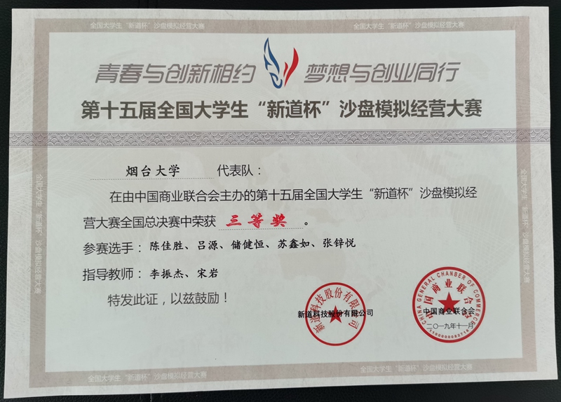 11月16-17日,第十五届全国大学生“新道杯”沙盘模拟经营大赛全国总决赛在南京举行,来自南开大学等全国30个省市的120所高校近800名师生参加了总决赛,我校代表队经过一天的紧张与激烈的角逐,最终荣获三等奖,此次总决赛包括吉林大学,南开大学,西南政法大学等来自全国各省市的120所高校参赛。烟台大学代表队以山东省赛第一名的身份晋级全国总决赛,在总决赛中,运用所学的专业知识,团结协作,奋力拼搏,体现了选手们精湛的工商管理技能,优秀的团队意识,极强的组织沟通能力。