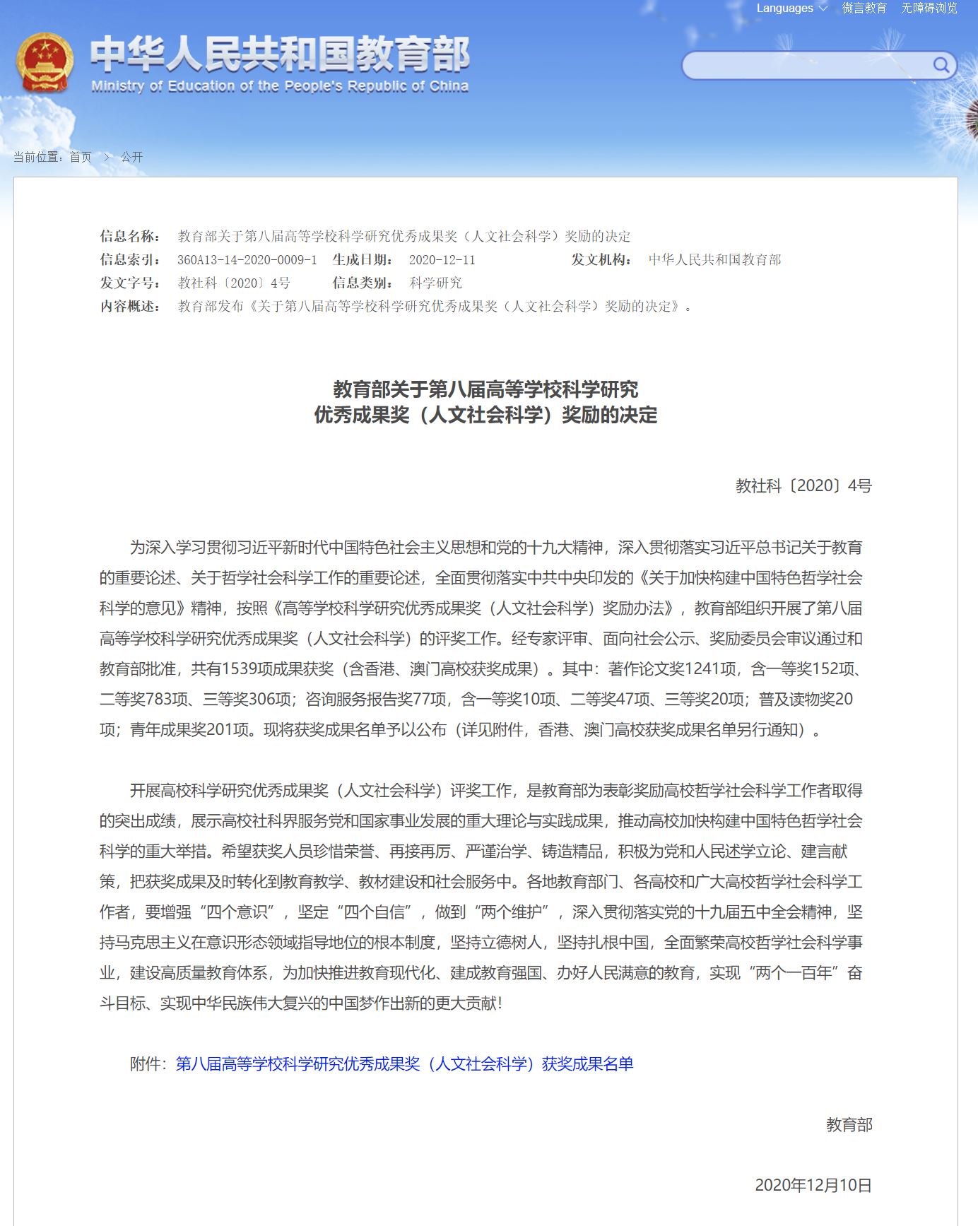 高等学校科学研究优秀成果奖(人文社会科学)奖,奖项三年一评,竞争激烈,最终评选的项目含金量高,被认为是我国人文社科领域最具公信力和影响力的重要奖项。