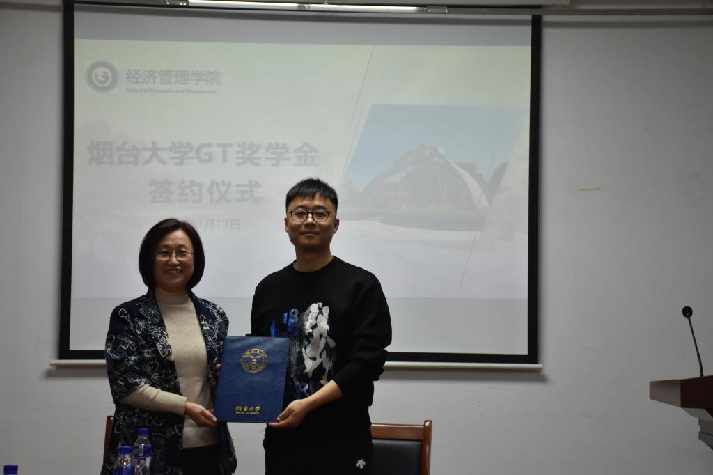 1月13日下午,学院举行“烟台大学GT奖学金”捐赠和实习基地签约仪式。青岛锦天丽达国际贸易有限公司总经理、学院1999级优秀校友韩世勤,青岛锦天丽达国际贸易有限公司综合管理部陈鑫,学院党政领导、导师及辅导员代表参加。仪式由副院长李振杰主持。