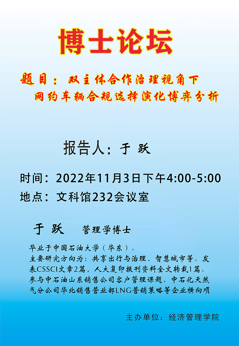 11月3日,经济管理学院在文科馆232会议室举办了“青年博士论坛”第八讲,于跃博士为此次论坛主讲人。学科带头人、青年博士教师及各专业研究生等50余人参加了此次讲座,讲座由副院长李振主持。