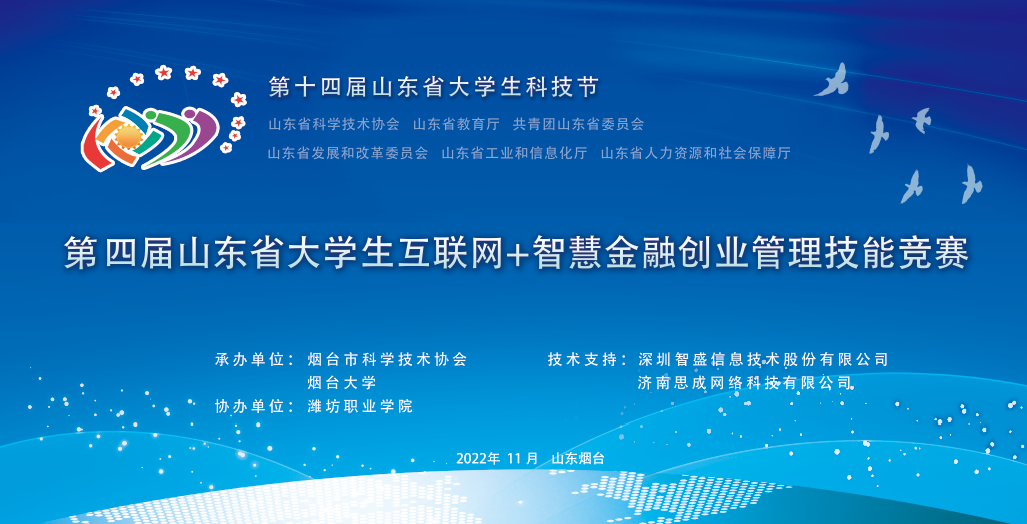 山东省大学生“互联网+智慧金融创业管理技能竞赛”作为由山东省科协、省教育厅、省团省委、省发改委、省工信厅、省人社厅等六部委联合主办的第十四届山东省大学生科技节系列赛项之一,由烟台市科协、烟台大学承办,深圳智盛信息技术股份有限公司、济南思成网络科技有限公司提供技术支持。