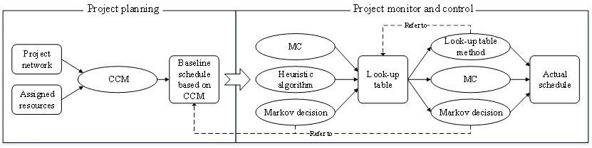 研究团队围绕生产一线的管理优化问题进行研究,对新兴的关键链项目管理方法进行拓展。在项目管理实践中,项目启动之前制定的最优计划,在项目执行过程中会因为各种不确定性干扰导致无法按预期执行。课题针对该实际问题,结合用于事前调度的鲁棒性资源约束项目调度问题和面对项目执行过程的随机资源约束项目调度问题,应用强化学习和近似动态规划法,提出了一种新的集成鲁棒性/反应性关键链项目优化调度方法。该方法进一步降低了项目计划调度的人工干预,提升了项目计划管理的自动化水平。研究成果是对关键链项目管理方法的一个完善,为关键链项目管理方法在各个领域中的推广应用增强理论基础。