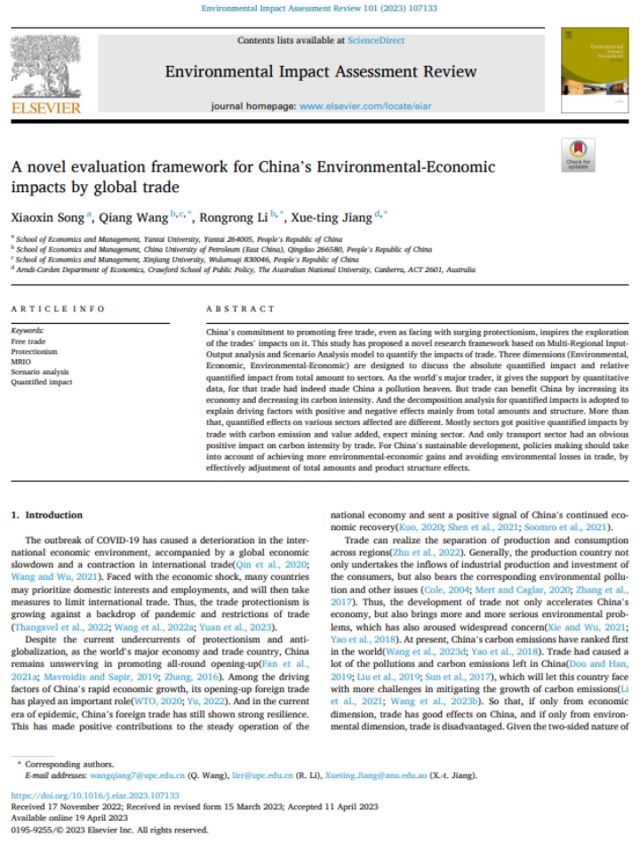 近日,我院宋晓欣博士在国际环境科学类别期刊《Environmental Impact Assessment Review》(中科院一区TOP,IF:7.9)上发表题为“A novel evaluation framework for China’s Environmental-Economic impacts by global trade”的高水平论文,宋晓欣博士为本文的第一作者,烟台大学经济管理学院作为本文第一单位。