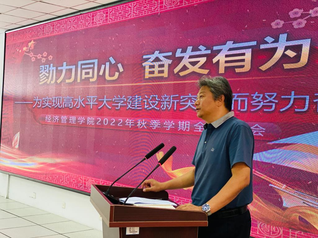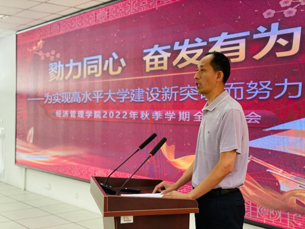 院长宋岩向全体师生逐一介绍了新入职的青年博士和辅导员老师,对经管学院注入的“新鲜血液”表示热切欢迎。随后,宋岩围绕人才引进、教学科研、竞赛指导、职称评审、绩效考核等各项工作作了全面详细的总结,并对学院上学期和暑期各项工作给予充分肯定。他指出,下一步,要紧跟学校发展节奏,聚焦高水平大学和高水平学科建设,着力提高思想政治素质和专业能力,弘扬“严真细实快”工作作风,积极进取,奋发有为,不断开创高水平大学建设新局面。