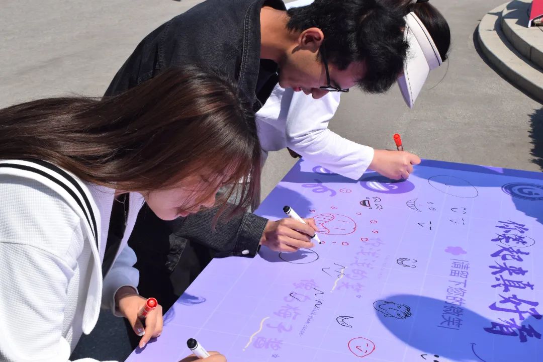 学院菁听心语心理辅导站在文科馆门前准备了“你笑起来真好看”微笑打卡展板,师生们积极参与,绘制富有创意的微笑表情,留下阳光的笑脸,并进行拍照打卡纪念。